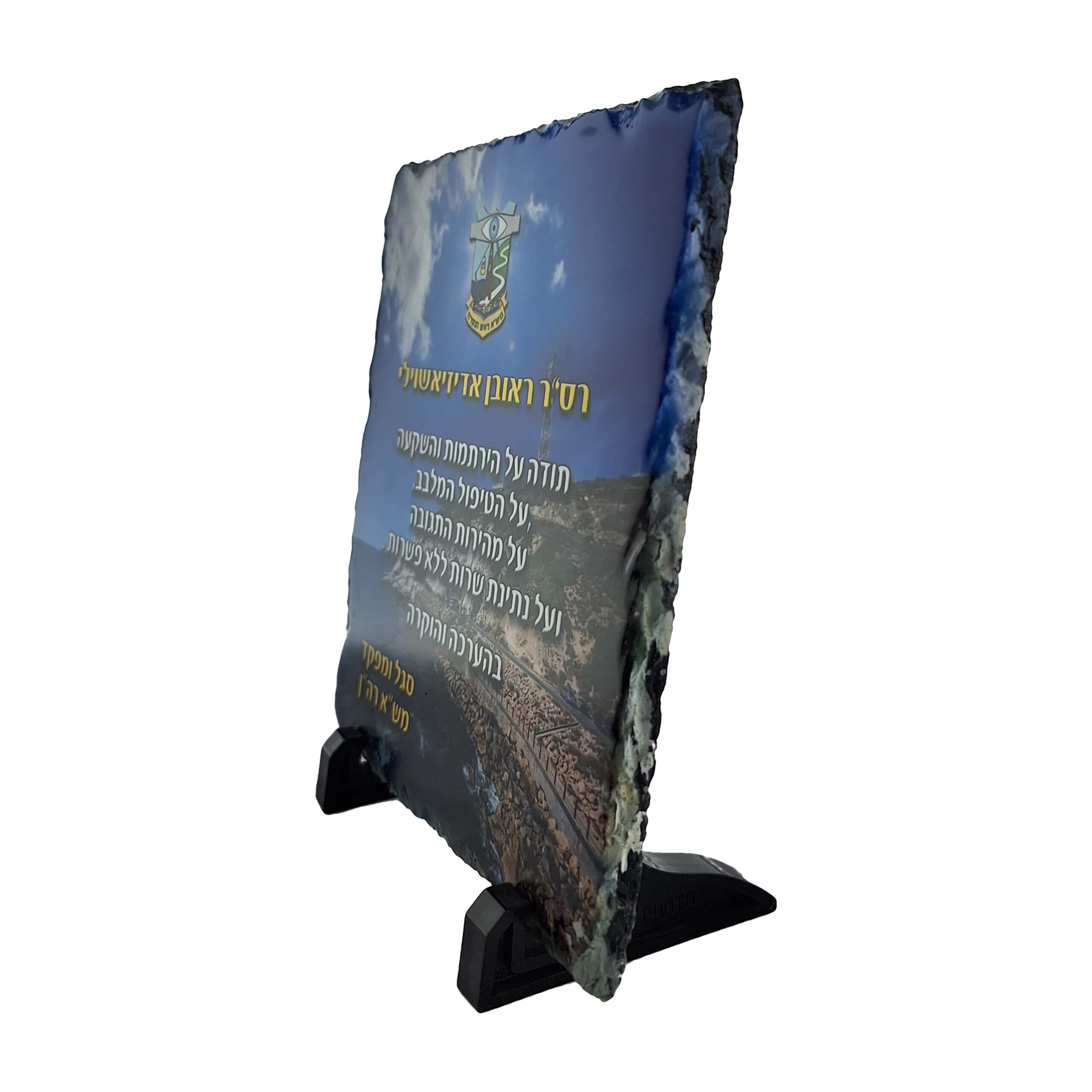 מגן הוקרה מאבן בזלתמגן הוקרה יוקרתי מעץ בזלת טבעית, עם עיצוב מרשים המבטא עמידות ויוקרה. כולל אפשרות להקדשה אישית בחריטה על האבן, ומשדר מראה קלאסי ומיוחד. אידיאלי לטקסים, פרסים והבעת הוקרה באירועים חשובים. מגיע עם שני רגליות פלסטיק חזקות